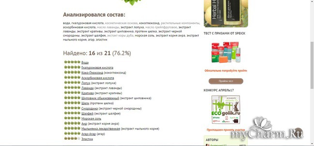 Кстати говоря, обратившись к списку компонентов, из которых состоит сей продукт, вы можете окончательно убедиться в его натуральности, даже не прибегая к помощи каких-то дополнительных сервисов. И всё же, для "галочки" посмотрим, что скажет ecogolik.ru