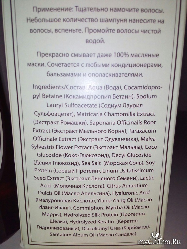 На первых местах списка находится: Кокамидпропил Бетаин и Содиум Лаурил Сульфоацетат – это мягкие ПАВ, которые разрешены для использования в натуральной косметике. Далее несколько экстрактов. И еще парочка мягких и безопасных ПАВ: Коко-глюкозоид и Децил Глюкозид. Завершает список ингредиентов масла, морская соль, гиалуроновая и Молочная кислоты, протеины шелка, кератин и мочевина. На упаковке указан состав на двух языках, один из которых русский. Поэтому подробный список можете прочитать там.