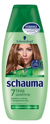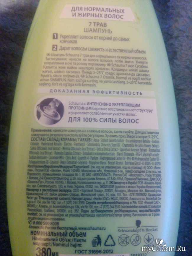 Внешний вид, обещания производителя. Шампунь Shauma 7 трав заключен в приятного зеленого цвета флакон. Объем у него достаточно приличный – 380 мл, хватит надолго. Крышка сверху упаковки открывается и закрывается щелчком, что достаточно легко и удобно. На передней стороне отчетливо видны названия брендов Schwarzkopf и Shauma, информация о названии шампуня, типах волос, для которых он подходит, и даже есть ярлычок о проходящей для пользователей очередной акции. Сзади флакона есть информация о действии шампуня, его подробном составе и объеме, адрес местонахождения производителя.