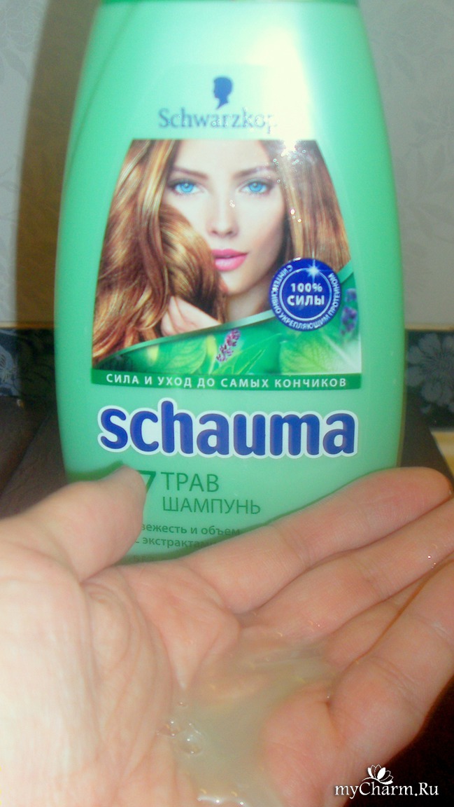 Мои впечатления от применения. При выдавливании небольшого количества шампуня на руку видим, что он густой, цвет практически белый, со слегка заметным зеленоватым оттенком. Если волосы загрязнены не очень сильно, одного применения шампуня может быть достаточно, но я обычно всегда мою голову два раза – первый раз для удаления загрязнений, второй – контрольный. Пенится Shauma 7 трав достаточно хорошо, несмотря на то, что в его состав входят природные компоненты. Я со своими нормальными волосами мою голову обычно раз в два дня, мне этого вполне хватает.
