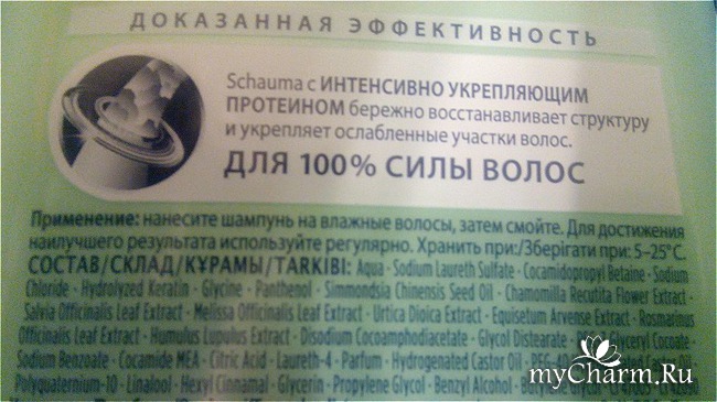 Shauma обещает нам, что регулярное использование данного шампуня благодаря повышенному содержанию в нем протеина обеспечит нам укрепление волос от корней до самых кончиков, восстановит их ослабленные участки и придаст волосам свежесть и объем. Очень хочется верить представленным обещаниям!