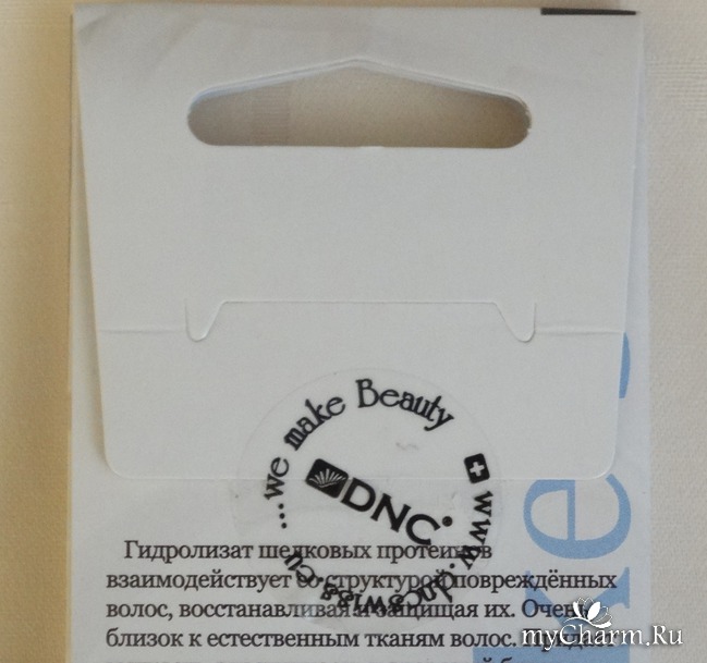 На лицевой стороне коробочки располагается наименование продукта и бренда DNC. Здесь же изображена прядь светлых волос.