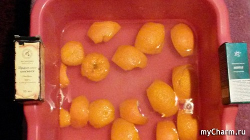 Для этого мне понадобится тазик с горячей водой. В тазик я добавляю соль, вот такие у меня красивые шарики и добавляю корки цитрусовых, сегодня у меня апельсины и пару капель масла, мне очень нравятся такие процедуры, настоящий 10 минутный релакс для ног.