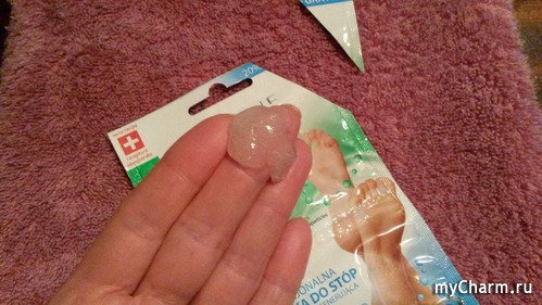 Ноги тщательно вытираю и наношу скраб. Вот он такой желеобразный, с тонким запахом трав, лимончика. Скраб наношу массажными движениями, распределяю по всей ступне, массирую пару минут. Чувствуются мелкие гранулы похожие на сахар. Смываю скраб, ноги вытираю и наношу маску. Маска белого цвета, кремообразная.