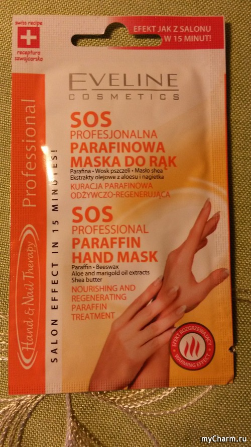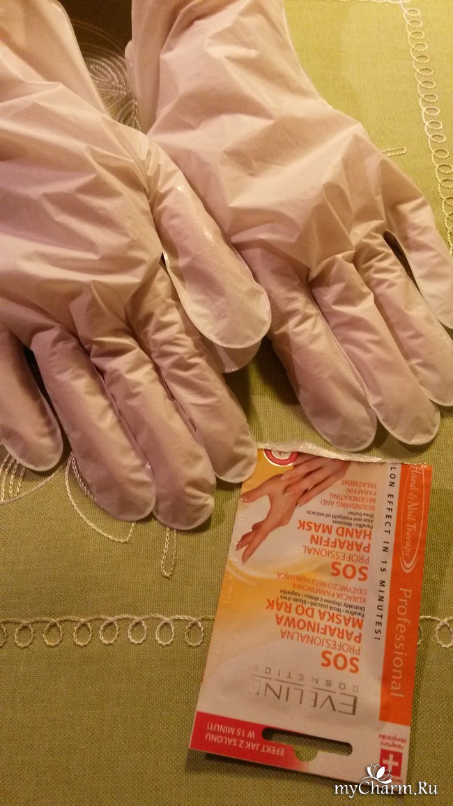 Парафиновое масло, масло ши, масляный экстракт алое, календулы экстракт, ланолин, аскорбиновая кислота, токоферол, ПЕГ-8, парфюмерные отдушки и ряд из трех парабенов. Согласно инструкции необходимо вскрыть пакетик и наложить маску на чистые руки, затем надеть хлопчатобумажные перчатки. Вообще-то было бы замечательно, это я забегаю наперед, чтобы в комплект маски входили перчатки. Хорошо, что у меня такие имеются и поэтому СПА процедура не сорвалась. Пятнадцать минут можно отдохнуть, расслабиться, кто предпочитает активное СПА, можно занять себя зарядкой или сделать любимую планку, на руках перчатки и все нам ни по чем!