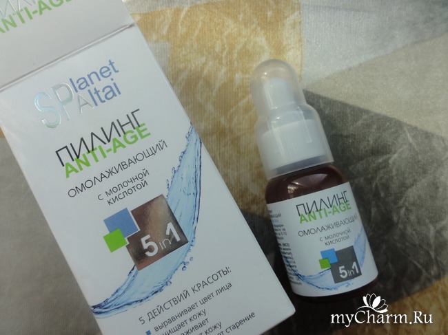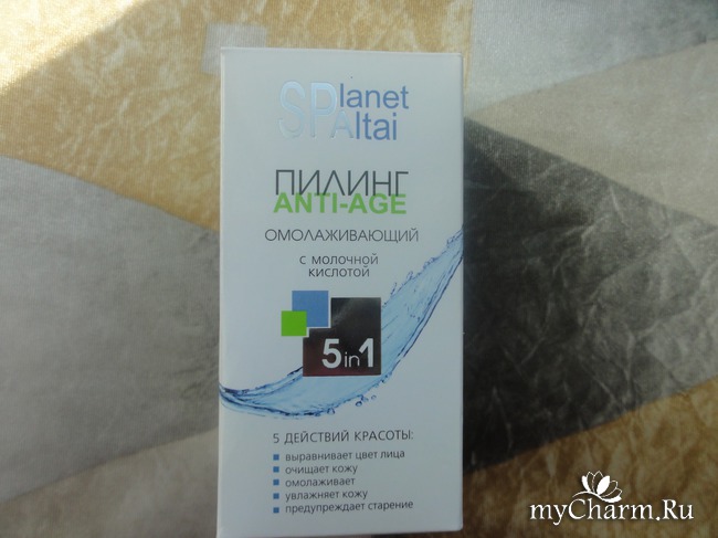 Пилинг Anti-Age омолаживающий с молочной кислотой от SPA Planet Altai помещен в маленькую картонную коробочку. Производителем сообщается, что это средство 5 в 1, а именно:
