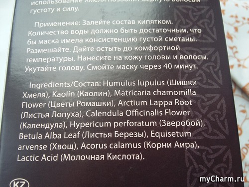 Основным компонентом маски является хмель. А точнее - его шишки. Оказывается, данный компонент способен регулировать баланс гормонов, в частности - эстрогена, дефицит которого является одной из причин выпадения волос. А тот комплекс трав, который числится в составе маски, призван для того, чтобы сфокусировать действие хмеля и донести его уникальные свойства до корней волос.