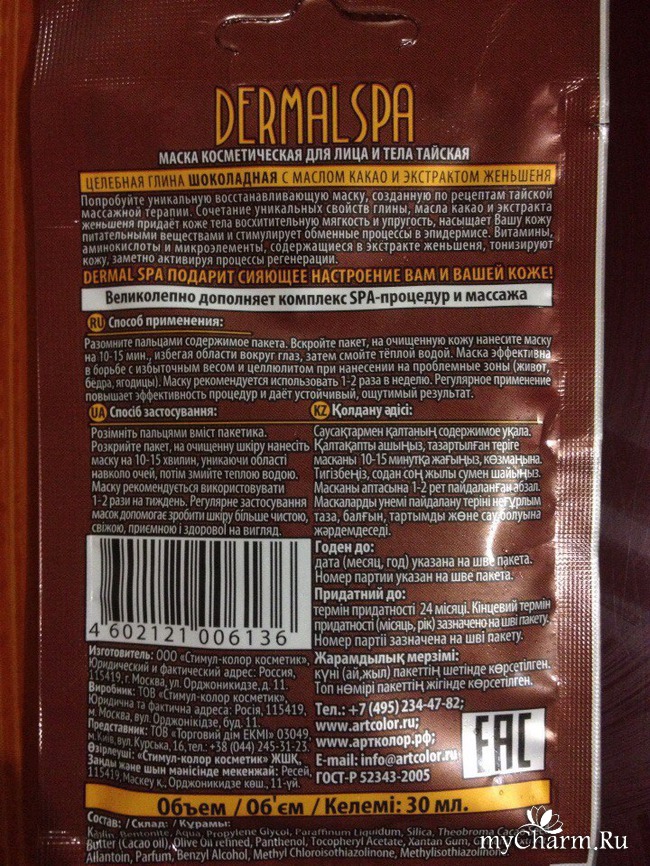 Объем маски 25 мл, для лица этого хватит вполне, а вот чтобы сделать грязево-шоколадное обертывания, я думаю, пару пачек надо) Так что если хотите подтянуть кожу, избавиться от целлюлита, улучшить состояние своей кожи, покупайте сразу побольше масочек, я думаю, что с таким суперским составом эффект будет 100%! Но о составе дальше в обзоре...