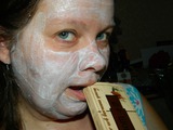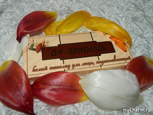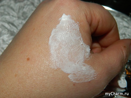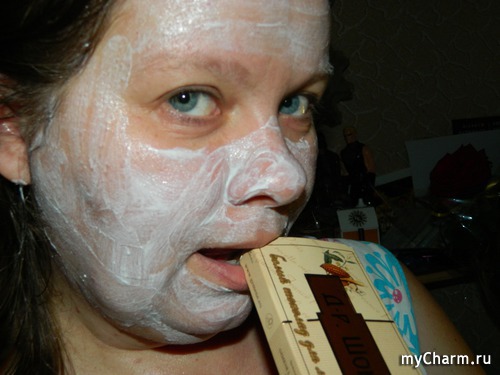 Маска представляет собой довольно густое пластичное маслянистое вещество белого цвета с умопомрачительным ароматом шоколада. Думается, если наносить средство сразу из пакетика, можно столкнуться с тем, что его будет сложно распределить по коже.