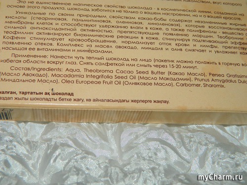 На кожу средство наносится легко, хорошо размазывается, ложится ровно. Аромат такой, что хочется лизнуть саму себя. Да и домашние сразу настораживаются (откуда такой откровенный запах шоколада, вдруг там без нас всё съедят?) и ходят вокруг лежащей и витающей в облаках меня кругами – тоже наслаждаются ароматом.