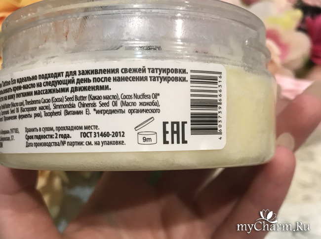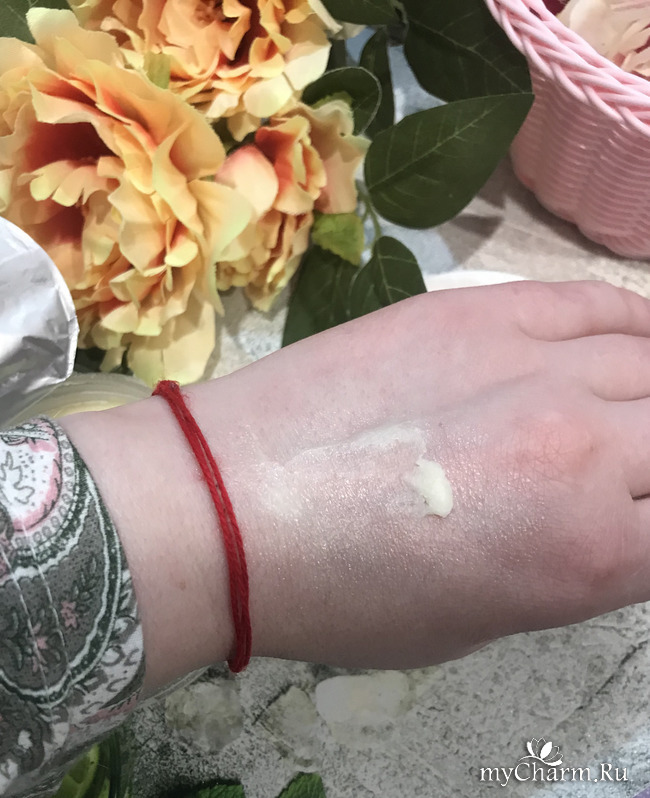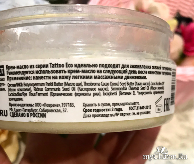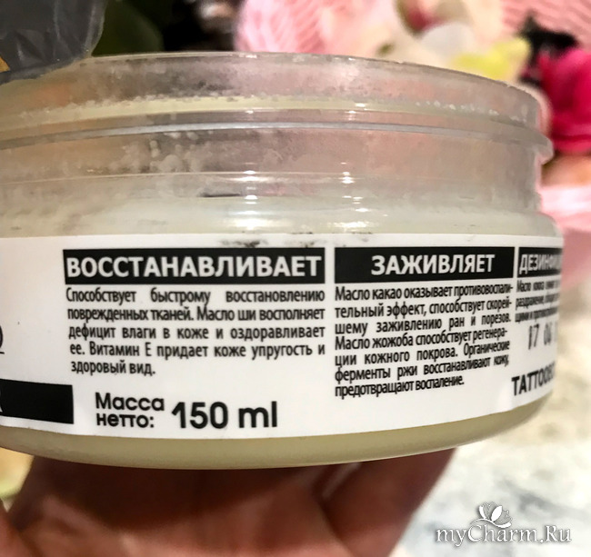 В состав входит масло ШИ, которое отлично заживляет и смягчает кожу. Витамин Е, масло какао, касторовое масло. Весь состав есть на упаковке.
