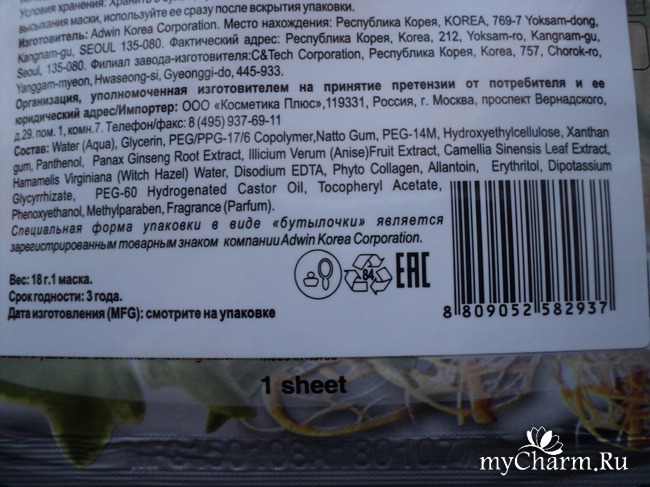 И это не все компоненты, которые входят в состав маски. В ней присутствует множество увлажняющих и ухаживающих ингредиентов, в том числе фито коллаген, натто гум, аллантоин, касторовое масло, токоферол ацетат (витамин Е), пантенол и др. По-моему, довольно неплохой состав для бюджетной маски. В пакете заложена тканевая маска для одноразового применения. Объем – 18 г. Средняя стоимость набора, состоящего из пяти масок, составляет 640 рублей.