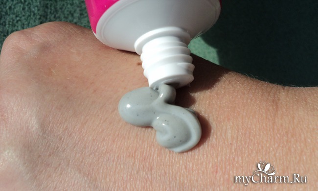 Он однородный и непрозрачный по цвету, но податливый, не густой и не плотный. Вот так выглядит, когда его начинаешь втирать в кожу. Как глиняная маска.