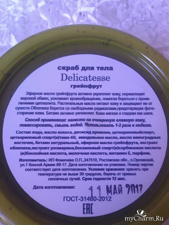 У скраба «Грейпфрут» очень приятный, освежающий и бодрящий аромат. Им приятно пользоваться. Расходуется скраб очень экономно, поэтому хватит его вам на долго. Одной баночки хватит на 15-20 применений.