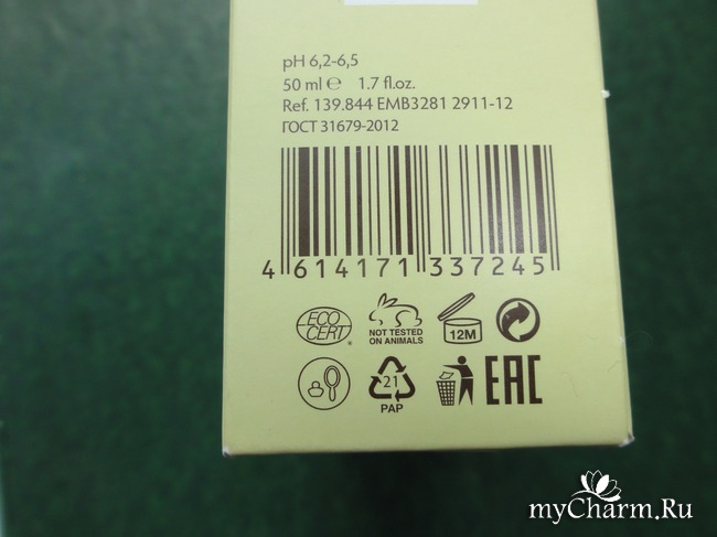 Флакон помещен в картонную коробочку, на которой есть уже более полная информация о продукте, указан состав, способ применения и подробно расписано действие косметического средства.
