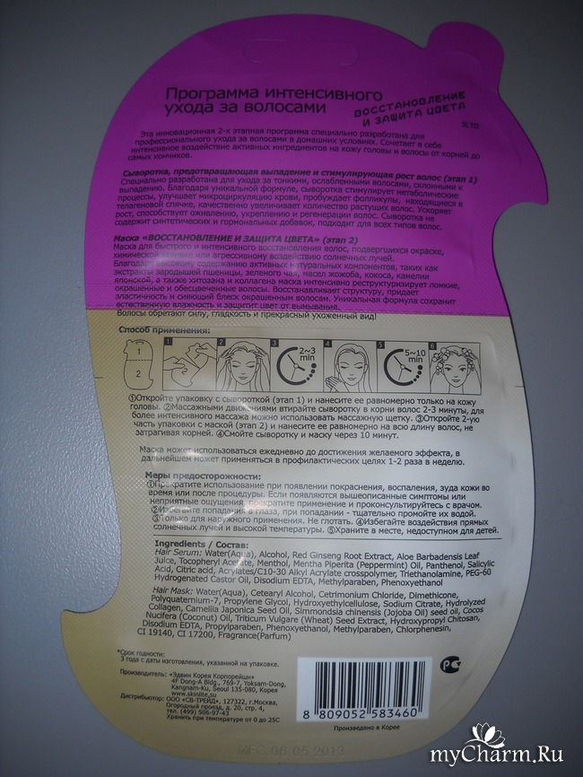Производитель не изменяет себе – все так же на обороте нас ожидает исчерпывающая информация о самой маске и о ее составе, а также подробная инструкция по ее применению. Правда, состав на сей раз указан не на русском языке. Хорошо, что я в свое время изучала иностранные языки, поэтому мне было несложно разобраться. Итак, в сыворотке мне удалось обнаружить экстракт корня уже знакомого по прошлым маскам красного женьшеня, мятное масло и экстракт алоэ барбаденсис. Ну а маска порадовала присутствием кокосового масла и масла японской камелии.