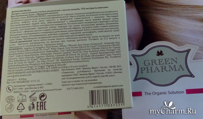 И конечно мимо Экспресс-масочки для волос Фармажожоба на сайте изготовителя GREEN PHARMA я пройти не смогла. Подумать только: нанесение всего лишь на 2-3 минуты сразу на мытые волосы, расчесав их при этом - и всё, можно смывать и сушить.