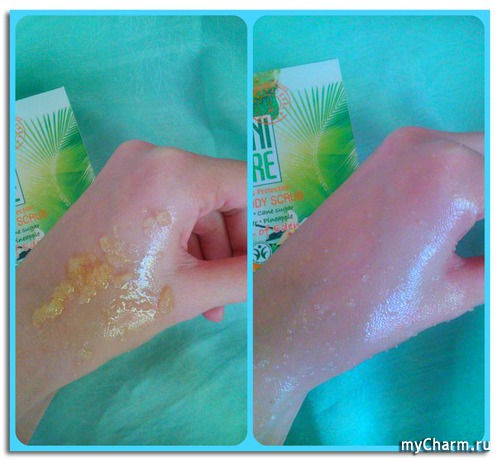 Захватив рукой небольшое количество скраба, начала распределять его по телу. Скрабирующие частицы мягкие и, несмотря на их крупный размер, совсем не царапают кожу.