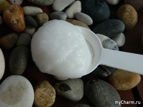 Меня удивил внешний вид скраба. Он больше похож на эмульсию, крем, но только не на скраб! Вещество кремообразное, густоватое, маслянистое. Белое, даже белоснежное, напоминающее по цвету и лёгкому сиянию жемчужины. Крупинки соли в нём прослеживаются едва-едва. Аромат приятный, парфюмерный: чувствуются алоэ.