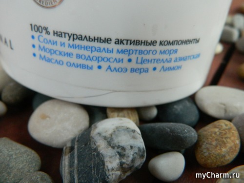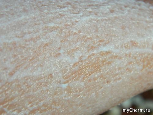 По коже скраб распределяется без затруднений. Благодаря консистенции, он мягко скользит, хорошо размазывается. Частички соли столь малы, что травмировать ими кожу просто не реально. Однако мне бы хотелось увидеть в скрабе более ощутимые крупинки соли, чтобы помассировать тело, как говорится, от всей души.