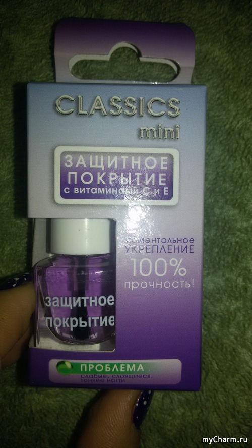 Кстати, в эту лечебную серию от Classics Mini входит еще 15 средств, внизу каждой из упаковок также описана проблема, для устранения которой создано то или иное покрытие ("Быстрая сушка", "Усилитель роста", "Тройная защита", "Питательное масло" и др.). Я же выбрала "Защитное покрытие с витаминами С и Е" в надежде хоть немного укрепить и подлечить мои ноготочки после смелых маникюрных экспериментов.