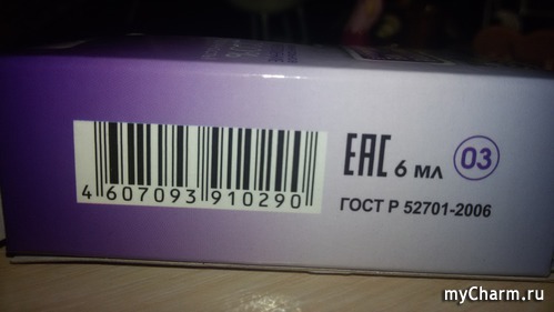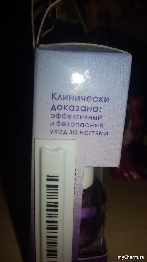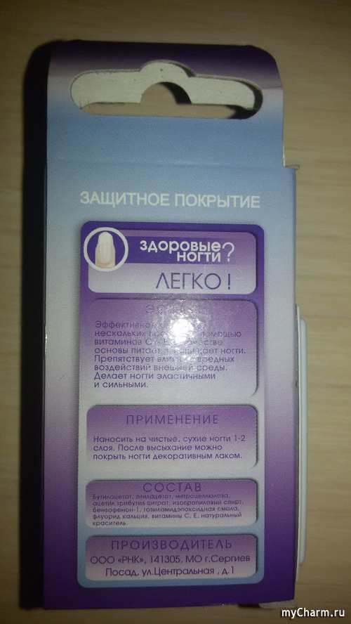С левого бока упаковки довольно просто, без особых дополнений обозначено, что эффективность и безопасность средства доказана клинически. Нельзя не обратить внимание на приятную пометку ГОСТ Р 52701-2006 с правого боку упаковки. На оборотной стороне коробки были расписаны свойства покрытия, способ его применения, состав и производитель. Порадовал своеобразный и незатейливый слоган: "Здоровые ногти? - Легко!"