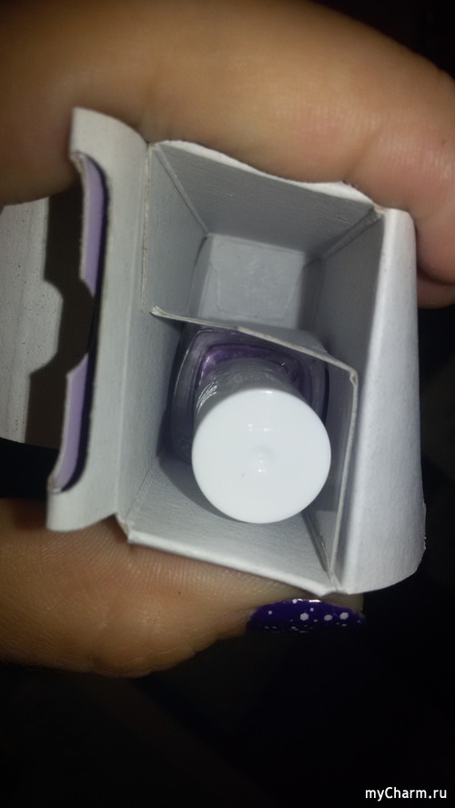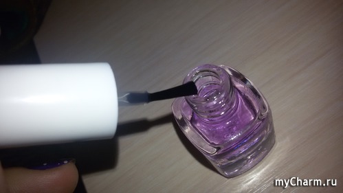 Натуральный краситель в составе (правда, какой - неизвестно) придает практически бесцветному лаку легкий, красивый, сиреневый оттенок под стать упаковке. Сквозь прозрачное стекло баночки просматривается пушистая черная кисточка - упругая и удобная. Она сразу набирает нужное количество лака, быстро и равномерно распределяет его по поверхности ногтевой пластины. Об аромате сложно сказать что-то определенное - обычный запах лака без каких-либо парфюмерных включений.