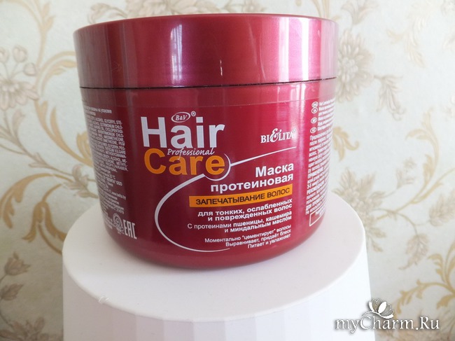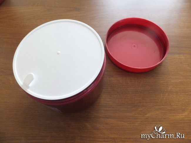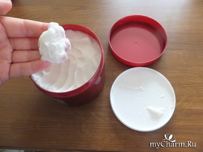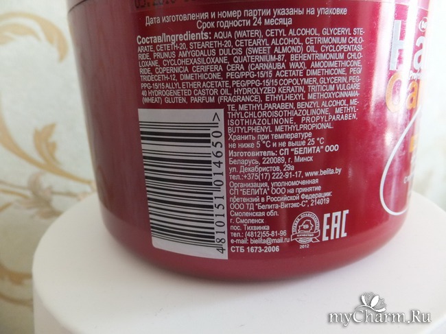 Раз в заглавии есть пометка «профессиональная», то нечего удивляться, что объем будет внушительным. Так и есть – здесь 500 мл, цена за такую банищу – около 3,5 долларов в Беларуси. Банка маски, как и у бальзама, круглая, вишневого цвета, с защитной белой крышечкой-пластинкой.