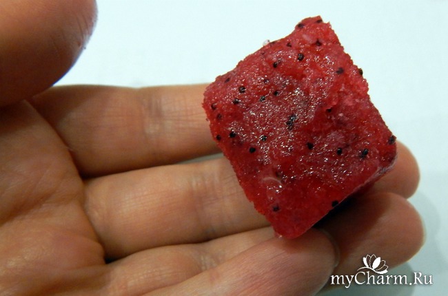 На этикетке указан срок - 6 месяцев. И дата изготовления - 1 октября 2015 года (совсем свеженькое). Хранить нужно в прохладном месте, и это я поняла сразу, как только взяла в руки клубничный кусочек – он сразу начал таять в моей ладони, тихонько перемещаясь по коже.