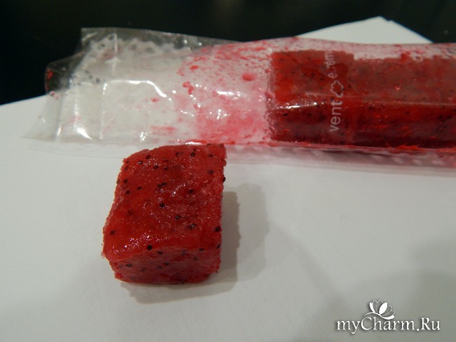 Мое первое впечатление: настоящие ароматные сладкие клубничные мармеладные конфеты – в пакетике 5 (размером, примерно, 2х3 см) кусочков клубники, даже с черными семечками.