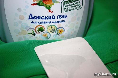Детский гель для купания малышей с зеленым дозатором имеет заметно (сквозь упаковку) темное наполнение. Это прозрачный гель с оттенком синевы (видимо за счет азулена). Имеет приятный сладковато-растительно-цветочный аромат. Легкий и успокаивающий. Создает умеренную пенку. Заботливо очищает кожу ребенка, не создавая раздражений и сухости.