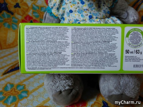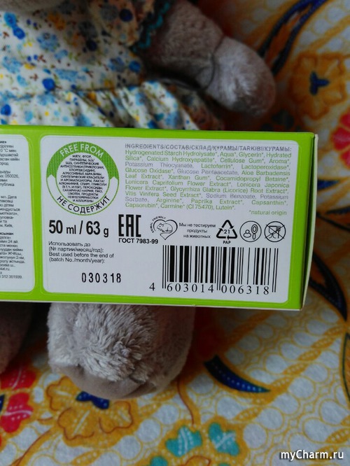 Многие зубные пасты могут обладать приятным вкусом, но все ли они полезны для зубов наших деток? Как родитель (а не как мой внутренний ребенок), первое, на что я обратила внимание – это натуральный состав: компоненты органического происхождения занимают 98%! В продукте нет тех «страшных» компонентов, которых следует избегать даже взрослому организму (уж детскому тем более!) – мяты, фтора, парабенов, лаурил- и лауретсульфатов натрия, продуктов нефтепереработки и аллергенов.Рассмотрев состав внимательнее, вы и сами убедитесь в этом: зеленым выделены составляющие натурального происхождения. Что еще для меня важно – продукт не тестировался на животных. Очень уважаю бренды, придерживающиеся подобных моральных норм.