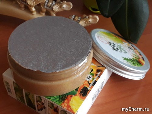 Банка со скрабом имеет объем 200 мл, что не мало. Само содержимое защищено металлической мембраной.
