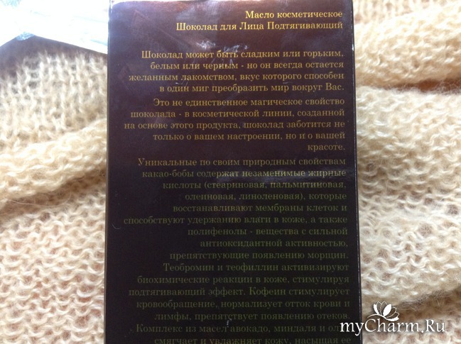 Когда я впервые услышала о применении шоколада в косметике, я очень скептически к этому отнеслась. Ну зачем делать шоколадные обертывания и маски, если их лучше кушать и недооценивала этот новый способ применения шоколада. Думала, что таким образом салоны просто-напросто переводят шоколад.Оказывается DNC не зря для подтягивающей маски главный ингредиент выбрал шоколад. В нем столько полезностей! Получается шоколад полезней намазать на себя, чем съесть! В какао бобах, которые являются составной частью шоколада, есть антиоксиданты, с помощью, которых из кожи выводятся токсины. Различные кислоты заживляют мелкие ранки на коже. А танин и кофеин снимают отеки. К тому же кофеин помогает бороться с целлюлитом (сразу представились девушки в бане обмазанные шоколадом). Еще в какао есть такие вещества, как теобромин и теофиллин, они как-раз придают коже сияние и здоровый вид. В составе шоколада можно найти и витамины: А B D F и микроэлементы: магний, калий, железо и др. Вот не зря же учителя рекомендуют перед экзаменом съесть плитку горького шоколада! Ведь он не только активизирует умственную деятельность, но и поднимает настроение!