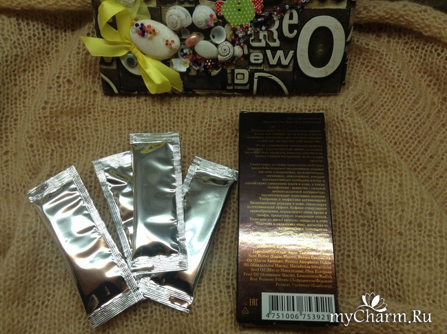 Упаковка, сами видите очень красивая, подстать дорогому шоколаду. Картонные коробочки выглядят дороже, приятны на ощупь и глазу. На коробке имеется защита от несанкционированного "взлома".Содержимое маски находится в небольших пакетиках - 4 штуки с отметкой, где легче открыть упаковку. Пакетики хоть и маленькие, содержимого в нем на раз очень даже предостаточно. Поэтому рекомендую маску не жалеть и наносить щедро на лицо и зону декольте. В следующее использование попробую разделить саше на 2 применения.