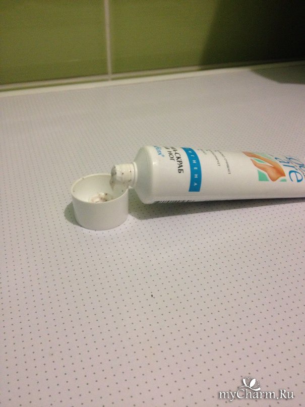 Выпускается он в стандартной для линии Foot Care тубе объемом 100мл. Система открывания-закрывания тоже вполне ординарная. Обычная закручивающаяся крышечка. Правда, стоит отметить, что закручивается она достаточно плотно, что позволяет немного жидковатому по консистенции скрабу не вытекать.