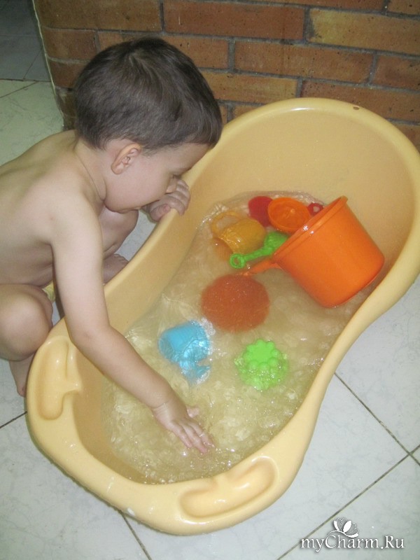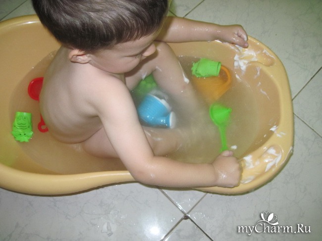 Для начала сын всегда любит просто поиграть рядом с ванной, переливая воду. Где-то через полчасика игр мы отправляемся собственно мыться. Там игры продолжаются.