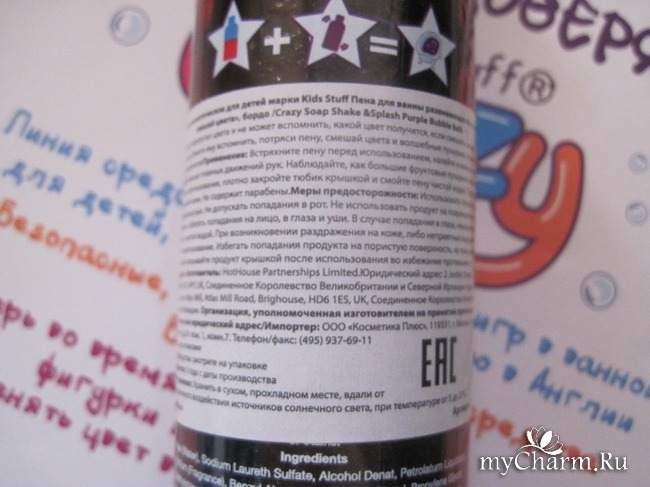 Как и другие средства Kids Stuff, состав развивающей пены для ванны не может не радовать. «Не содержит парабены» - надпись, особо радующая сердце мамы. Вообще не понимаю, почему при современном уровне технологий многие производители все еще используют в косметике (и особенно детской!!!) парабены и прочую гадость. Для меня безвредность средства имеет первостепенное значение, да и других стараюсь просвещать о вреде парабенов по мере возможности. Так что британцам из Kids Stuff – десять с плюсом из десяти за безопасную детскую косметику.