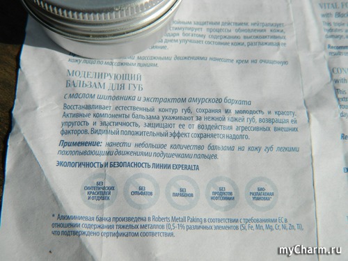 Бальзам заключён в жестяную круглую баночку с откручивающейся крышкой. Есть и картонная коробочка, на которой изложены сведения о средстве, плюс вкладыш – путеводитель по косметическим средствам линейки Experalta.