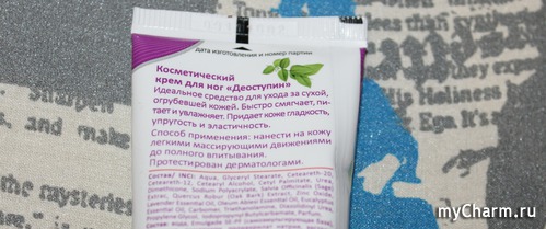 Отмечу, что дезодорирующий эффект ощущается. Конечно, не так, как от крема с ментолом. Никакого холодка, мгновенно освежающего кожу не чувствуется. Да и собственно какого-то ярко выраженного запаха у крема нет. Я бы сказала, он имеет аромат свежей мази из аптеки. Нет, не пробирающей до слёз мази Вишневского и не напичканной отдушками мази, запах которой порой заметнее, чем само действие препарата. Нет, это жидковатый по консистенции крем без ярко выраженного запаха. И когда наносишь его, каких-то особых ощущений нет. Ну, таких, чтобы щипало, холодило, подёргивало или горячило. Но когда впитается, есть это еле уловимое изменение: коже стало приятнее, как будто она стала чище, свежее. Вот это и есть, видимо, дезодорирующее воздействие. Но такого, что пятки заблагоухают ландышами или сиренью, не ждите. Да и запах чистой кожи на ногах куда уместнее цветочного аромата.