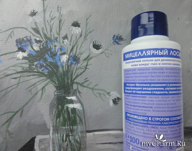 В составе лосьона на первом месте, разумеется, вода, затем экстракт василька, который часто применяется в очищающих средствах вокруг глаз, так как он снимает раздражение кожи, дарит ей свежесть, комфорт, увлажняет и успокаивает нежную кожу век. Далее в составе мицеллы, глицерин и другие не особо выдающиеся компоненты, которые часто встречаются в очищающих средствах.