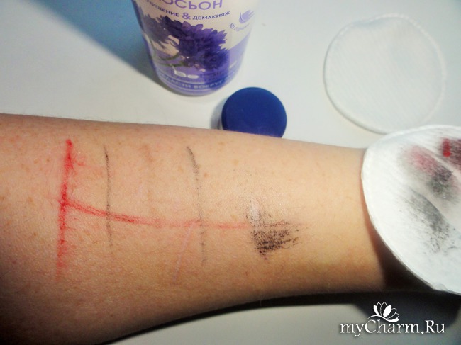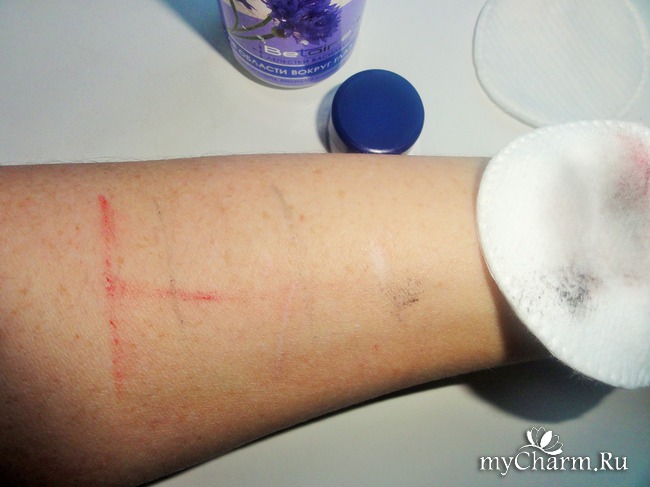 Это видно на фотографиях, где на руку я нанесла карандаш для губ, бровей, век и тушь для ресниц. С первого раза очищение очень плохое, да и второй раз кожа очистилась не полностью. Поэтому, снимая макияж с глаз, нужно потратить не один диск, все время смачивая их лосьоном. По этой причине средство заканчивается довольно быстро.