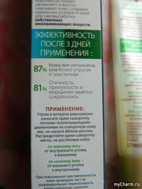 Но меня беспокоит не это, а наличие в средстве парабенов и силиконов. Так что в ближайшее время займусь тщательным анализом предлагаемой косметическими фирмами продукции для области вокруг глаз и, надеюсь, всё-таки найду «своё».
