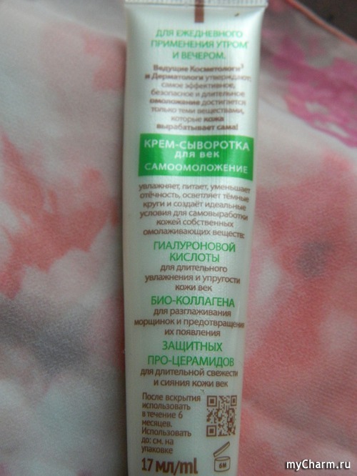 Увлажняет прекрасно – кожа вокруг глаз становится более упругой. Более никаких плюсов этого средства мной выявлено не было. Отёчность и припухлости никуда не денутся, если они имеются, про морщины и говорить не стоит. Никакого самооложения я не заметила, хотя, положа руку на сердце, и не надеялась на это. То же самое можно сказать и о сохранении молодости. На мой взгляд, это очередная рекламная уловка.