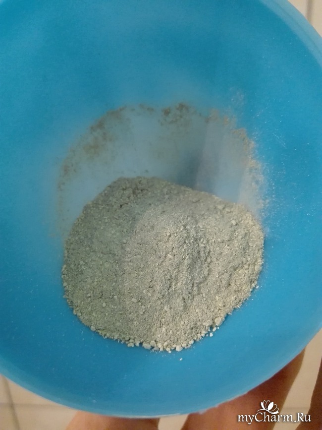 На вид глина зеленого цвета. Для приготовления маски надо насыпать глину в неметаллическую посуду обязательно, это на упаковке написано. У меня для таких масок есть вот такая маленькая мисочка пластиковая. В нее я насыпала 2 чайные ложечки косметической глины.