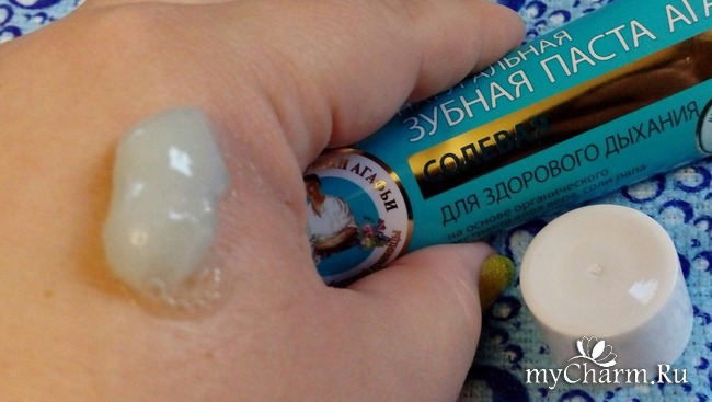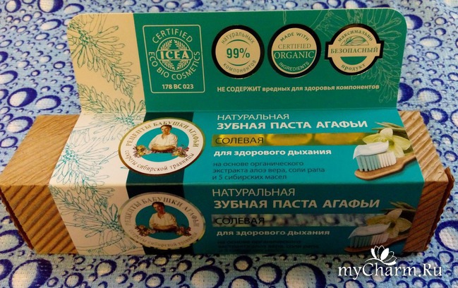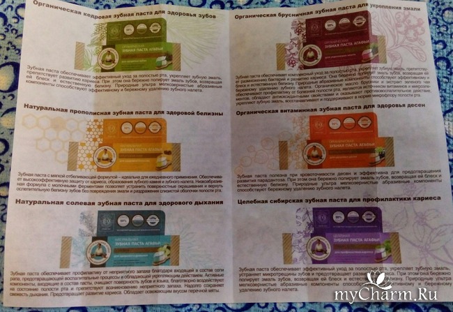 Традиционно для бренда «Рецепты бабушки Агафьи», в коробочке был вкладыш, содержащий рецепт от бабушки Агафьи для здоровья зубов, а также ассортиментный перечень органических и натуральных зубных паст этого бренда с различным функционалом и предназначением. Для каждой зубной проблемы обязательно сыщется свой вид пасты.