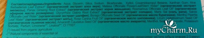 Зато полезностями, воздействующими на наш ротик, очищающими зубки и препятствующими плохому запаху изо рта является аж 99% компонентов натурального происхождения. Их состав: 5 масел (масла розмарина, бурачника, льняное, шиповника и амаранта), 6 органических экстрактов (экстракты алоэ вера, мелиссы, корня женшеня, солодки, шалфея, мяты), а также соль рапа, которая обладает укрепляющим действием и служит профилактикой воспалительных процессов.