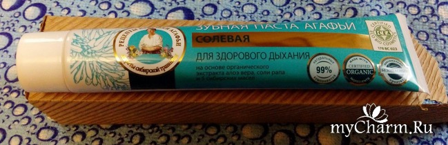 Сегодняшней героиней обзора будет Зубная паста для здорового дыхания «Солевая» от довольно-таки распространённого в России (да и не только) бренда «Рецепты бабушки Агафьи». Вот и сама «бабушка» на упаковке присутствует, что всегда характерно для этого бренда. По одному взгляду вскользь на этот рисунок, и искать название бренда на упаковке уже не нужно. Попав пару-тройку раз на не подошедшую мне косметику, я практически перестала приобретать эту марку, но оригинальная упаковка и уверение производителя в том, что зубная паста на 99% состоит из натуральных компонентов сделали своё дело, и этот интересный продукт занял своё место на полочке в ванной.