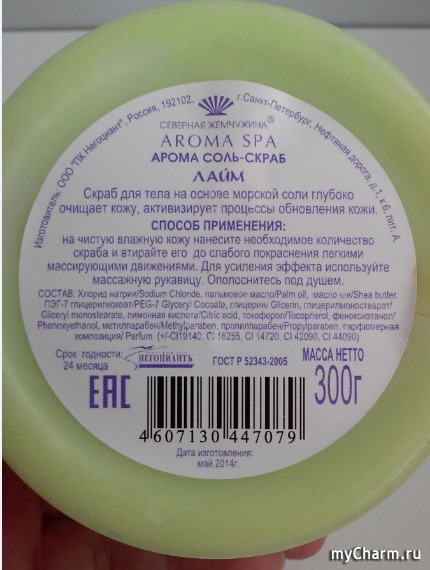 Сверху на этикетке написано название продукта - солевой пилинг из серии "Aroma Spa" с ароматом Лайм. Натуральный продукт, который глубоко очищает кожу и способствует обновлению клеток. С боковой стороны баночки мы видим надпись арома соль-скраб и название бренда Северная Жемчужина.