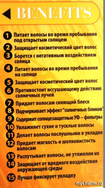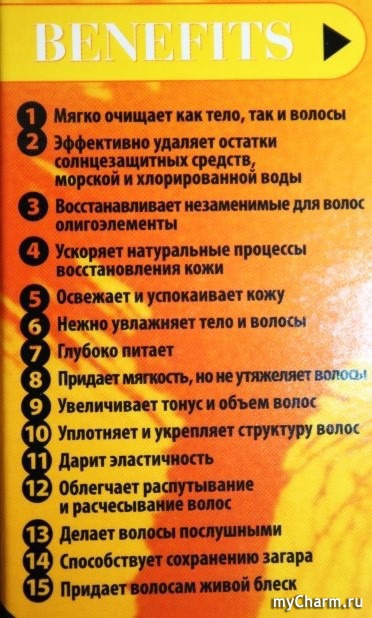 Такой внушительный перечень достоинств сначала может показаться нереальным, однако, эффект действительно будет заметным, и все сомнения уйдут прочь. Теперь девушкам с окрашенными волосами можно спокойно купаться, загорать и греться на горячем песочке, не волнуясь о том, что волосы постепенно выгорят и превратятся в сухую мочалочку. Ныряйте в соленые пучины, резвитесь с детьми на побережье, но после всех пляжных веселий обязательно примите душ и помойте голову с шампунем “All in 15ne sun”.